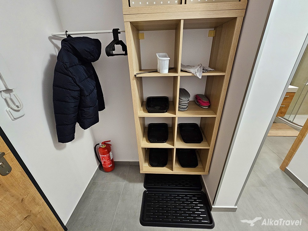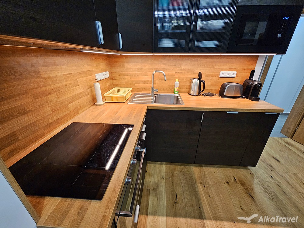 V apartmánu: vstupní chodba, obývací pokoj s TV, posezením/gaučem, kuchyňským koutem (myčka nádobí, indukční sporák, trouba, mikrovlná trouba, rychlovarná konvice, kapslový kávovar Cafissimo, topinkovač, lednice s mrazákem, koupelna (sprchový kout, umyvadlo, WC), 2x čtyřlůžková ložnice (1x palanda se standardními lůžky 90×200, 1x palanda s rozšířeným spodním lůžkem 140×200). Krytý balkón a terasa.